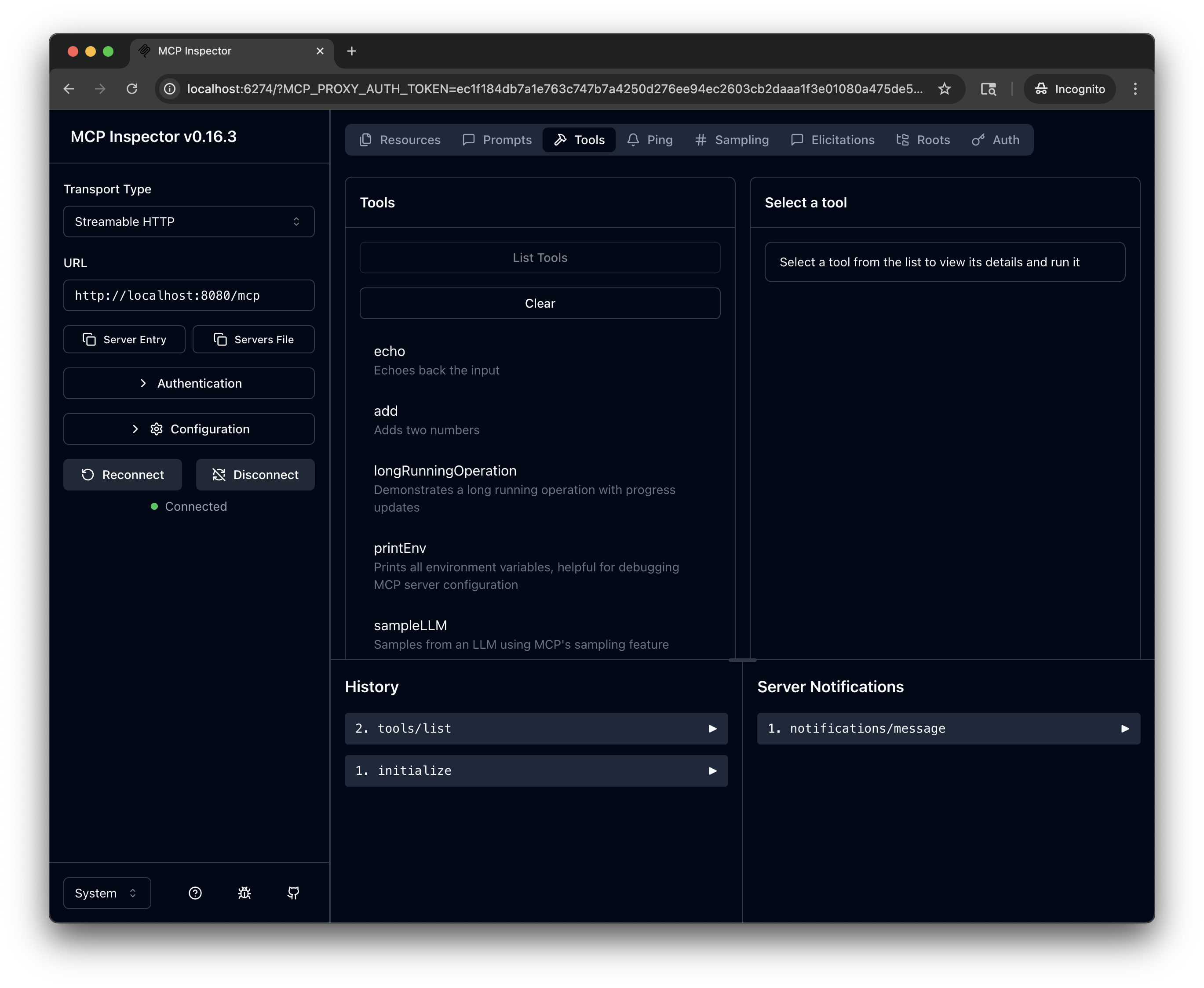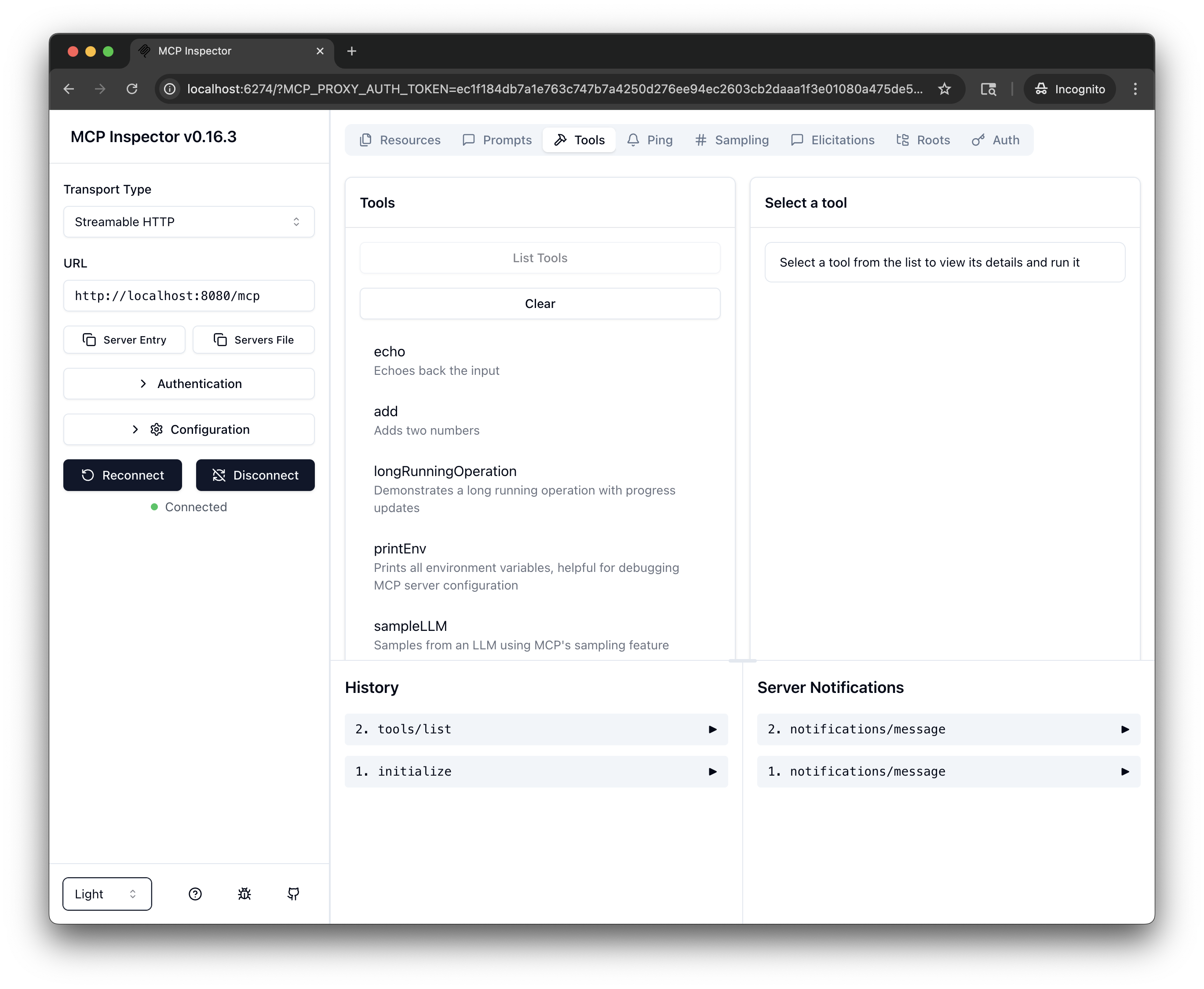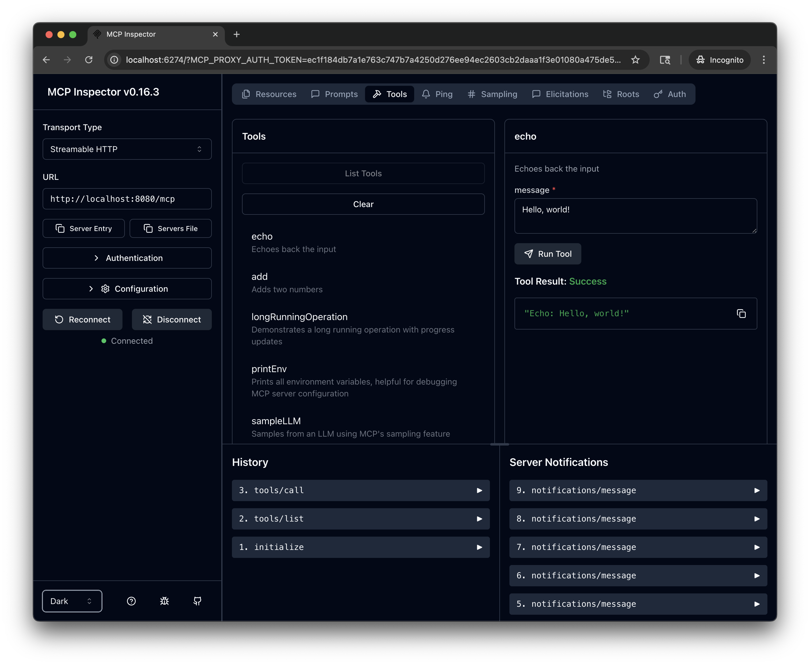 5. Test the tools: Select a tool, such as echo. In the message field, enter a message, such as Hello, world!, and click Run Tool.